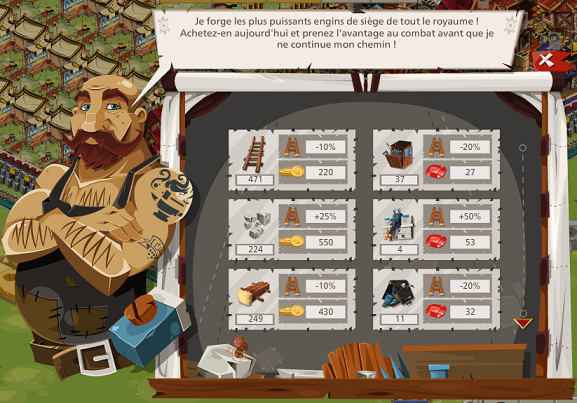 L'armurier vous permet d'acheter des engins de défense et d'attaque contre des pièces. Vous pouvez aussi en acheter des plus puissants mais en échange de rubis.